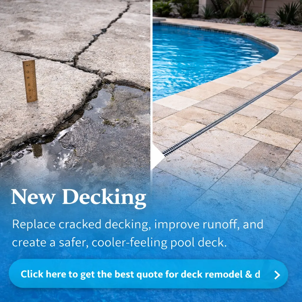 Replace cracked decking, improve runoff, and create a safer, cooler-feeling pool deck. Click here to get the best quote for deck remodel & drainage!